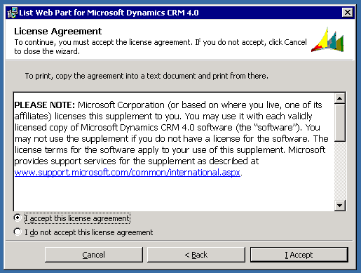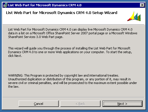Click the ListWebPart.msi file to run the List Web Part for Microsoft Dynamics CRM 4.0 Setup wizard.