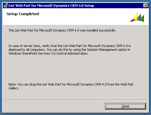 Also, as you can see from this setup completion screen, that the CRM 4.0 List Web Part is installed into the Solution Store in Central Administration (Central Administration > Operations > Solution Management), since this is the case, you do not need to run the installer for each specific web application you would like to deploy this to, you can deploy to additional web applications as needed from Central Administration.