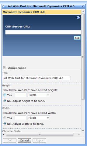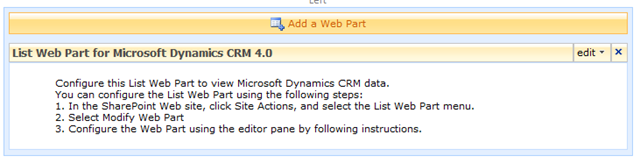 Included here are the instructions for installing and configuring the CRM 4.0 List Web Part for WSS 3.0 and MOSS 2007. This is not intended to replace the supplied documentation that comes with the web part installation package below.