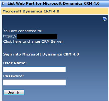 Once it is connected, it will say so (and give you an option for connecting to a different server (a MAJOR improvement over the CRM 3.0 List Web Part), and allow you to enter in your username and password to connect.
