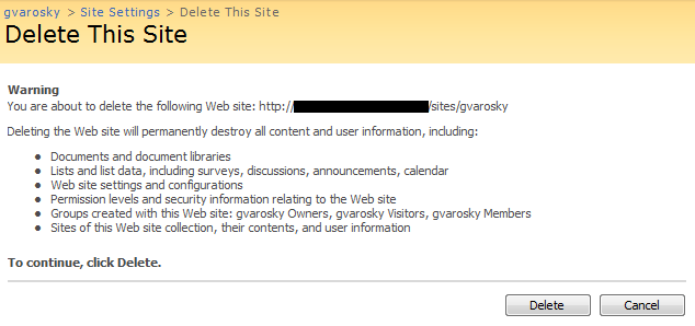 I’ve had to deploy this solution for several clients in the past, where they have given full control of sites (webs) over to one or more people, to help manage a large deployment. However, on more than one occasion, the sites themselves have been deleted, “accidentally”, even though when you go to delete a site in SharePoint, you are prompted to confirm this action, without any confusing ‘Yes or No’ buttons, only ‘Delete’ and ‘Cancel’, which, in my humble opinion, is just about as straight forward as you can be.