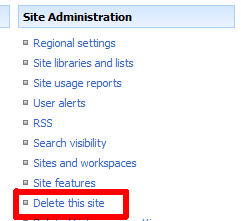 No, this is not a request for the Live Spaces administrators to follow through on, this is going to be a post about the ‘Delete This Site’ link, or more aptly, the DeleteWeb custom action within SharePoint, on the Site Settings page.