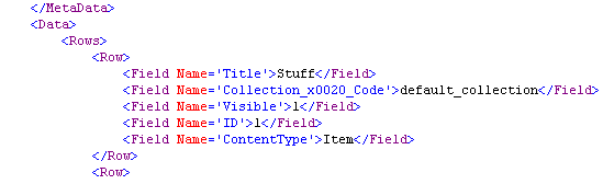 I generally trim off all of the fields that are not needed, and just keep my fields which I am using, for example, in the above, just trimming out everything but my fields. Which should generally all appear at the top of the <Row> element, as shown below.