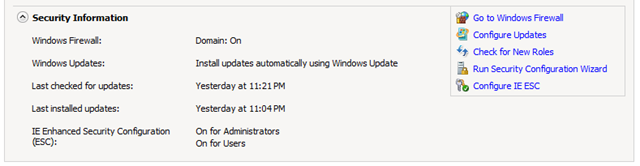 It’s fairly easy to do. Go to Start > Administrative Tools > Server Manager and from the main screen, there is a section called Security Information (screenshot below). You will notice some actions to the right of the security information summary. You will see one for Configure IE ESC, click that.