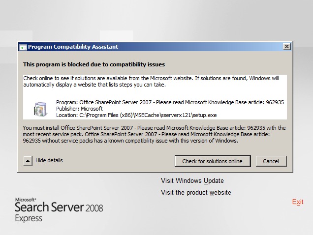 The error itself is a little confusing, especially since I was running the x64 install, and the message indicates an x86 binary… anyways… It turns out that Microsoft Office SharePoint Server 2007 SP2 needs to be slipstreamed into the Search Server 2008 Express install to do so. I will post the instructions below, but, to give credit where credit is due, thanks to Andy Kemp’s blog post here for the instructions – it saved whatever precious hair I have left on my head for other, more important things.