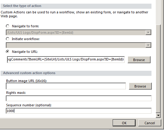 Our phony business case for this custom action is such – We are surfacing our ULS logs into a SharePoint list, and want to collect feedback on specific log entries for later consumption. We need to link to a form elsewhere in the site, which we will pass a reference to the item in question, as a URL.
