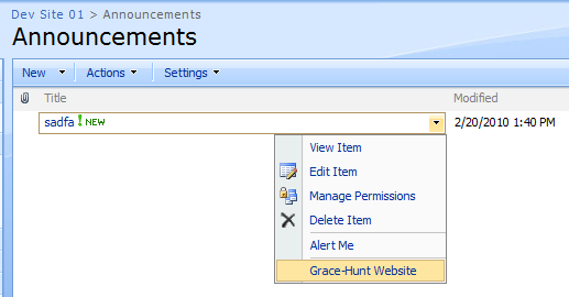 Now, we know, especially if you’ve been to any of my sessions on Custom Actions, that the only thing you REALLY need in here is the Title attribute, but, we’ll add an Id, Location – the Edit Control Block, a Title, set the RegistrationType to List, and, let’s give it a sequence number of 12345, and set the UrlAction to be http://www.grace-hunt.com.