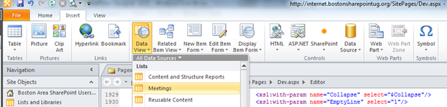 In SharePoint Designer, let’s add a Data View Web Part to our page, by going to the Insert ribbon tab, selecting Data View, and choosing the list which we want to create an XSLT Data View for…