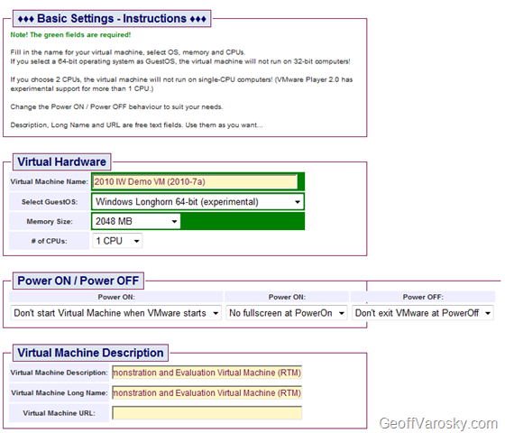 Ok, we then need to create the VMX files (the VMWare virtual machine configuration files)… to do so, I first copied one over by hand, but, that just lead me to BSOD after BSOD when booting up, so, I did a quick search, and found VMX Builder, a free utility from PowerWF. This however complained that I did not have a license to perform this action, which makes no sense, as it is a FREE program. So, off I went looking for something else… and found a web-based approach called EasyVMX! With such enthusiasm in the name, I had to check it out.