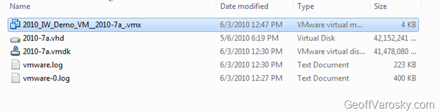 I then downloaded the VM from the ZIP contained above, and opened it, and copied out the VMX files that was created, and pasted that into the folder with our converted 2010-7a VMDK