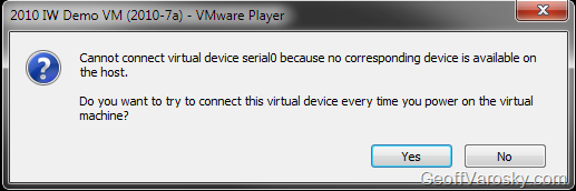 Now, time to flush out a few configuration differences from the EasyVMX generated configuration, I answered No to all of the following pop-up questions (see note above when using EasyVMX configuration on avoiding these)