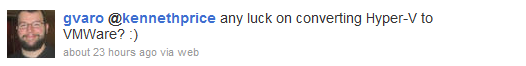 So, that is how you can convert a Hyper-V image to VMWare, especially in the case of the 2010 Information Worker Demonstration Virtual Machine(s). I hope this helps! This allowed me to then send the following tweet back to Ken Price