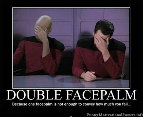 This blog entry image at the top with the “Double Facepalm”, not only from FunnyMotivationalPosters.info, but, discovered and brought to my attention by none other than Mark Rackley, who implanted this in our ‘Just Freakin’ Work! Overcoming Hurdles and Avoiding Pain’ session we co-present on. Thanks Mark – works perfect to convey my sentiments today about this…
