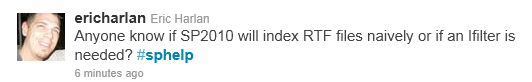 Found out today while answering a #SPHelp question for my buddy Eric Harlan, that SharePoint 2010 does not natively index RTF files, it requires an iFilter.