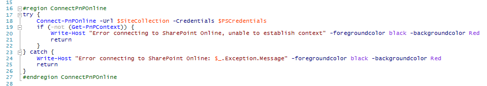 Write-Host "Error connecting to SharePoint Online, unable to establish context" -foregroundcolor black -backgroundcolor Red