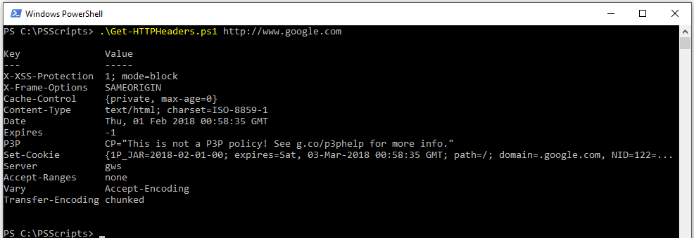 I named the script Get-HTTPHeaders.ps1, you can save it as whatever you’d like, or, incorporate it into your script as a function, or not even read this post… whatever you want to do. I just find it handy, and wanted to share it.